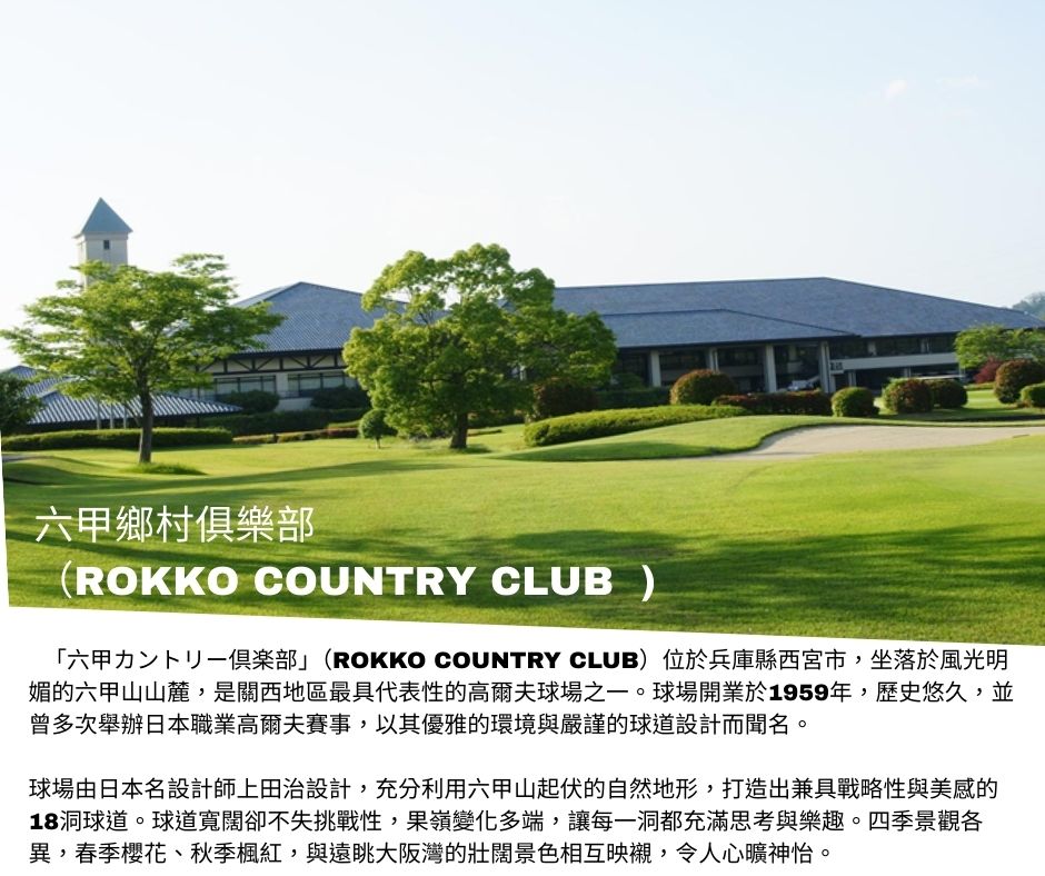 | 球敘第一場:六甲鄉村俱樂部 (日巡賽場) – 六甲山觀景台 前往溫泉區附近美麗球場,球敘後前往六甲山觀景台拍照,返回飯店晚餐休息。 |
